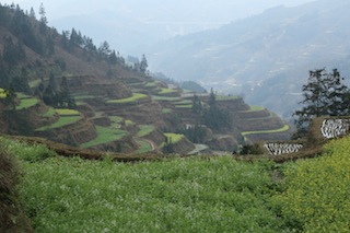 Mr Lu’s father is in his eighties, but he helps with the food preparation (which, from what I saw, meant cleaning mountains of spring onions outside the hotel each morning) and tidying things away. Their two eldest daughters, aged seventeen and thirteen, work as waitresses in the restaurant, snatching moments in front of the enormous television to follow their favourite soap opera (a colourful Tang dynasty saga at the time of writing) whenever they can. Mrs Lu gets up early, cleans the rooms, drinks her coffee, and prepares ingredients for the day’s meals, helped by Mr Lu. When people come into the restaurant, Mrs Lu will prepare their food – the commis chef, while Mr Lu presides over the stovetop, wearing a floppy, white chef’s hat that he was given during his two months at cooking school in Guiyang. Farming is squeezed in whenever they have time. Their youngest daughter, aged seven, is the only person in the family without a specific job. She’s still a carefree little girl, dancing around the yard outside the hotel and petting the family cat as it curls up around the embers that warm the family’s small table in the restaurant.