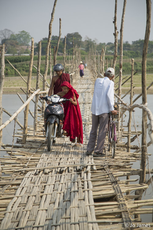 Monks push their motorbike past U Sein Win and his bicycle on a seasonal bridge outside Bhamo. Spanning one of the Ayeyarwady’s tributaries, this bridge is swept away by rainy season floods. Villagers rebuild it when the floods subside each year, and charge a small toll for using it. (I wonder if monks are exempt?)
